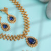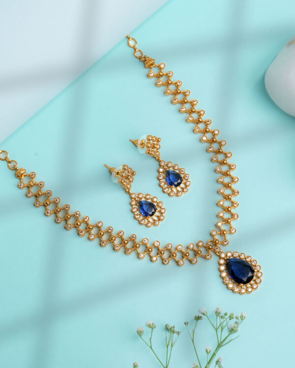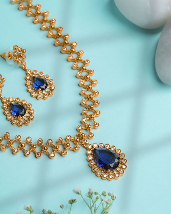 Crafted with a premium gold-tone alloy and polished to a high sheen, the design balances regal charm with contemporary symmetry. The central blue pear-cut stone draws immediate attention, while the surrounding micro-crystal border adds layered brilliance and depth. The matching drop earrings echo the same halo motif, completing the ensemble with perfect proportion and visual harmony.