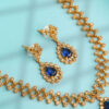 This elegant Vosgi necklace and earring set showcases deep sapphire-blue teardrop stones framed by a luminous halo of brilliant clear crystals, creating a refined centerpiece along the neckline. The necklace is constructed in a graceful lattice-style gold-tone framework, where each circular crystal link connects seamlessly to form a fluid, jewel-studded chain that reflects light from every angle.