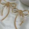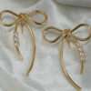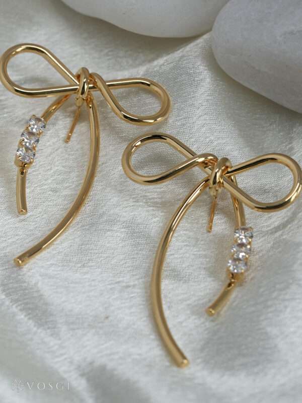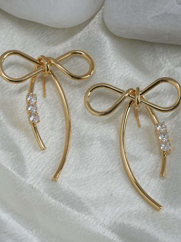 Bring graceful minimalism to your jewellery wardrobe with these Vosgi bow-knot stud earrings, designed to blend soft femininity with polished modern style. Crafted in a radiant gold-tone finish, the sculpted ribbon silhouette forms a delicate infinity-style bow, symbolising elegance and effortless charm. From the centre drapes a slender curved drop accented with a row of sparkling crystal stones that catch the light with every movement.