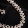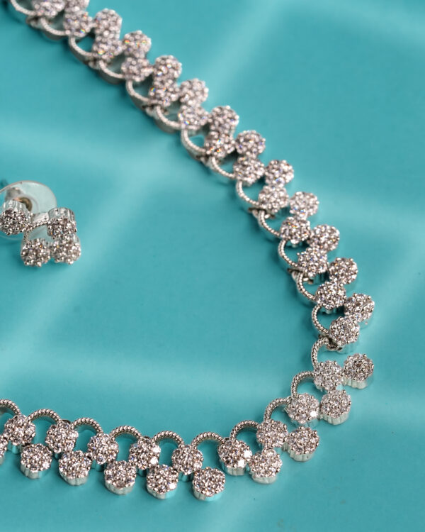 This elegant Vosgi necklace and earring set features a continuous trail of floral-inspired crystal clusters, arranged to form a graceful curve along the neckline. Each blossom motif is meticulously crafted with multiple round-cut clear stones, creating a radiant sparkle that reflects light from every angle. The delicate scalloped linking between each cluster adds fluidity and refinement, giving the set a soft, feminine rhythm while maintaining a strong statement presence.