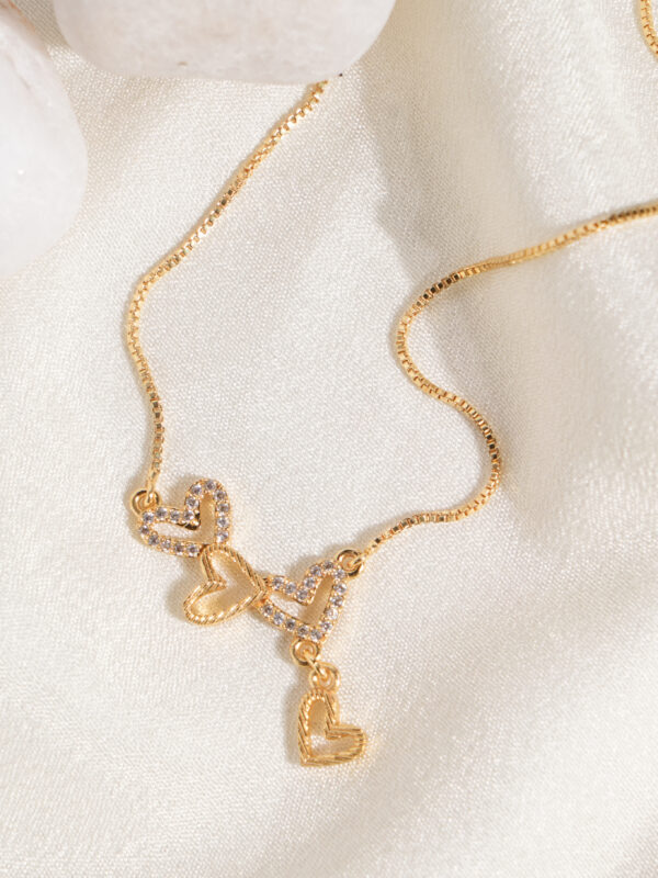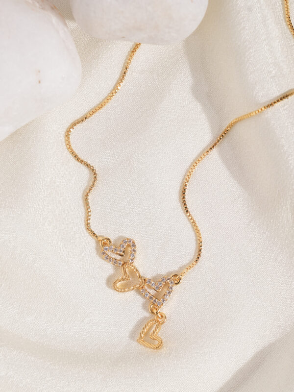 Celebrate elegance and romance with this Vosgi crystal heart cluster pendant necklace, designed to add soft sparkle to everyday and occasion wear. The centerpiece features three delicately layered heart motifs accented with shimmering crystals, finished with a charming dangling heart drop for added movement and grace. Each curve is carefully crafted to reflect light beautifully, creating a refined yet playful statement.