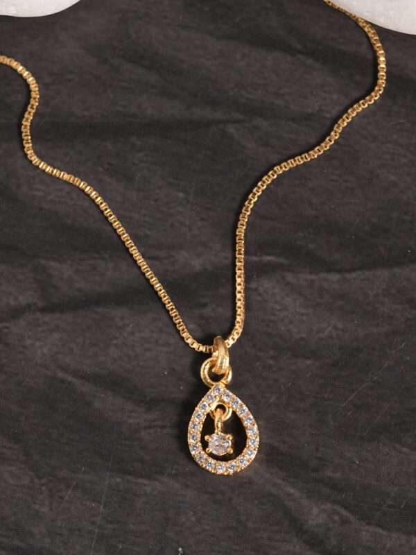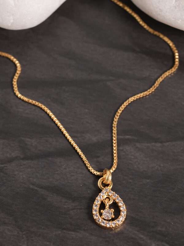 Add refined sparkle to your jewellery collection with this Vosgi crystal teardrop solitaire pendant necklace, crafted for effortless everyday elegance. The pendant showcases a graceful teardrop outline studded with shimmering crystals, framing a suspended solitaire stone at the center that moves gently with every step, catching the light from every angle. Paired with a sleek gold-tone box chain, this design balances modern minimalism with timeless charm. Lightweight and comfortable, it is ideal for daily wear, office styling, festive outings, brunch looks, or evening occasions. The clean silhouette makes it easy to layer with other chains or wear solo as a subtle statement piece. Versatile and elegant, this necklace complements sarees, kurtas, dresses, and western outfits alike. It also makes a thoughtful gift for birthdays, anniversaries, Valentine’s celebrations, or special moments. With its sparkling detailing and classic teardrop form, this Vosgi pendant is perfect for women who prefer jewellery that feels graceful, stylish, and endlessly wearable.