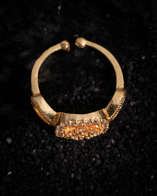 Fashioned in a warm gold-tone alloy, the band features elegant ridged detailing along the shoulders, lending texture and artisanal character to the silhouette. Fine micro-prong settings secure each stone precisely, reflecting meticulous craftsmanship and a high-jewelry finish. The stones appear to be premium-grade cubic zirconia, selected for their diamond-like clarity, uniform brilliance, and luminous fire.