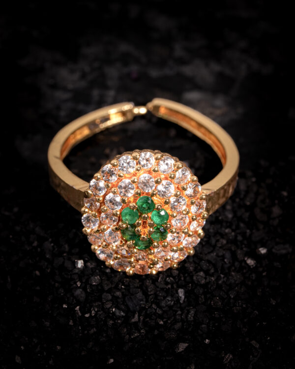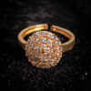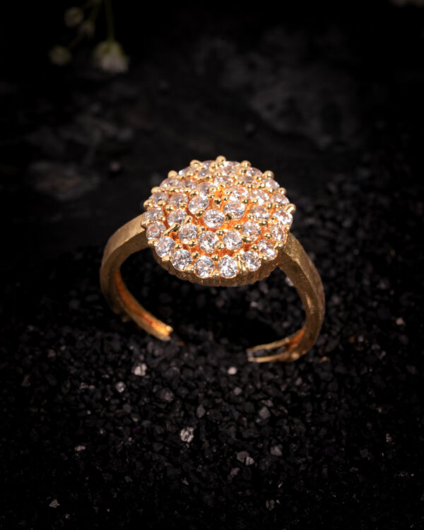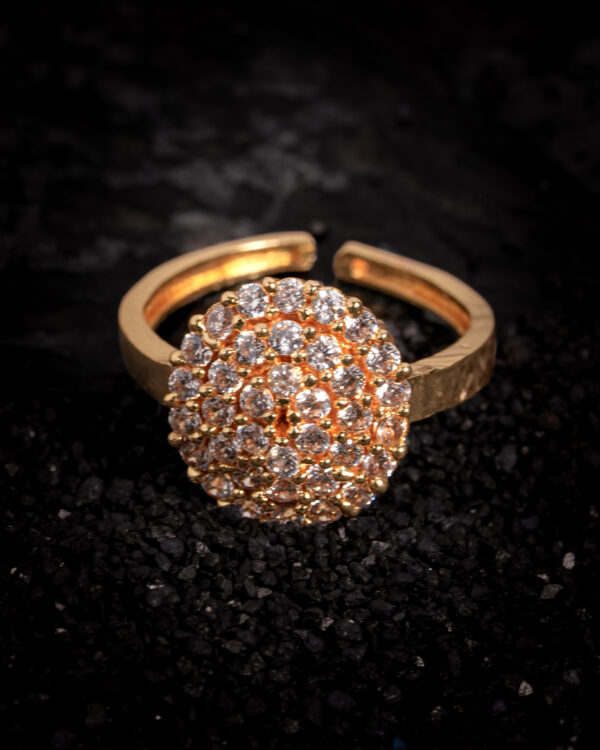An adjustable open-band structure ensures a comfortable and flexible fit without compromising elegance, making it ideal for both daily glamour and formal occasions. The circular top measures approximately 12–14 mm in diameter, offering a substantial presence while remaining lightweight and refined on the hand.