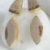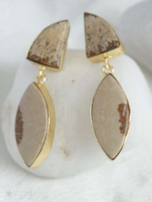 Both stones are bezel-set in a satin-finish gold-tone frame, adding warmth and refinement while highlighting the natural texture and subtle translucency of the stones. The clean geometry lends a contemporary feel, while the muted pastel palette keeps the look graceful and versatile.