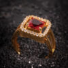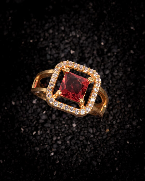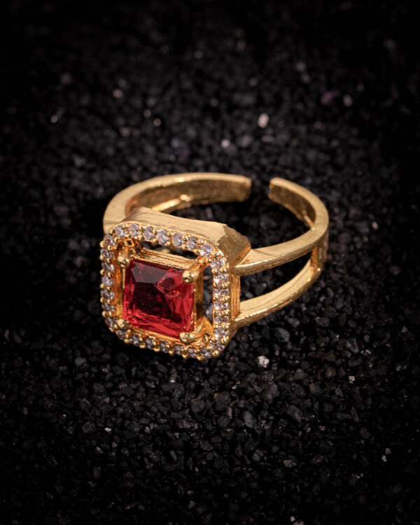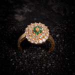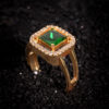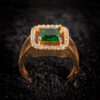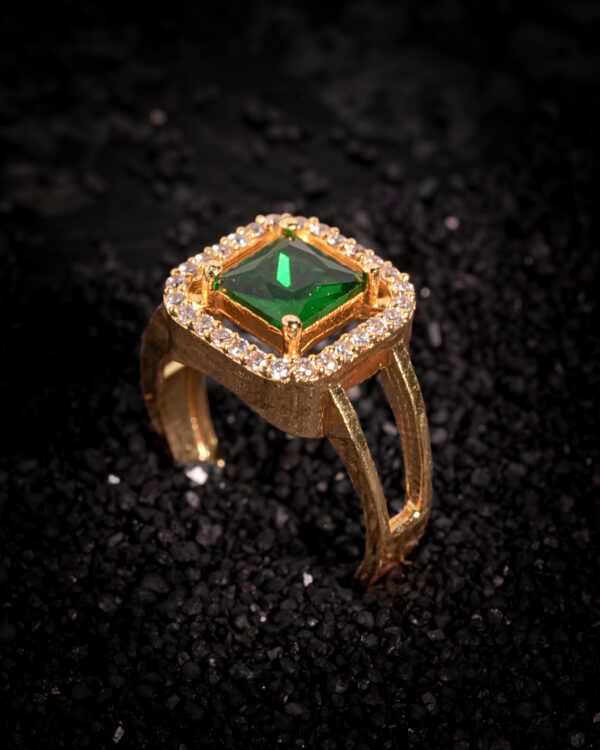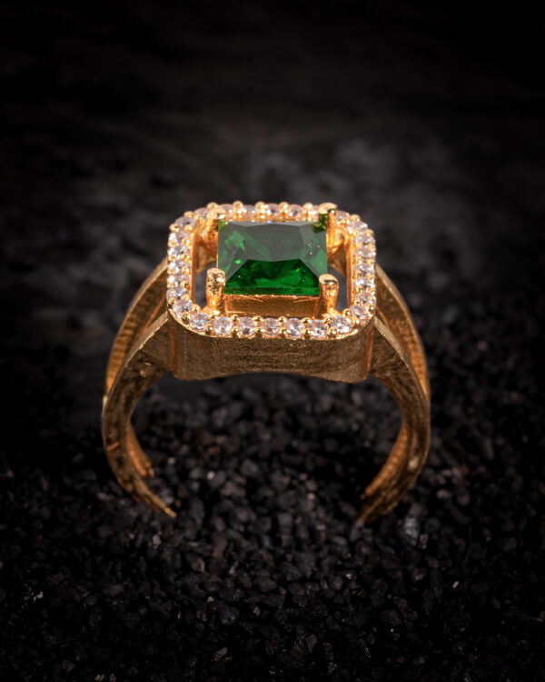 Crafted in a rich gold-tone alloy, the ring showcases sculpted architecture with a raised setting and split-band silhouette that lends both strength and visual drama. Fine prong work secures the center stone, while micro-settings around the halo demonstrate meticulous craftsmanship and attention to detail. The stones appear to be premium-grade cubic zirconia, chosen for their clarity, consistency, and diamond-like brilliance, paired with a vivid emerald-toned centerpiece for striking contrast.