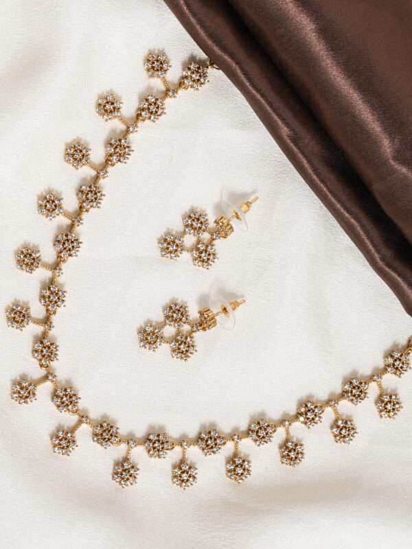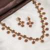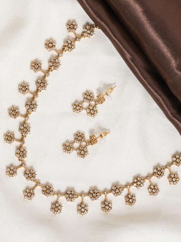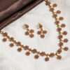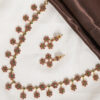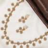 Paired with matching drop earrings that echo the same clustered motif, the set delivers a coordinated and elegant presence ideal for weddings, festive celebrations, and ceremonial occasions. The textured gold finish enhances the handcrafted appeal, while the evenly spaced links keep the silhouette balanced and refined.