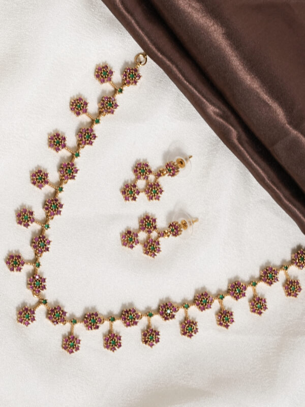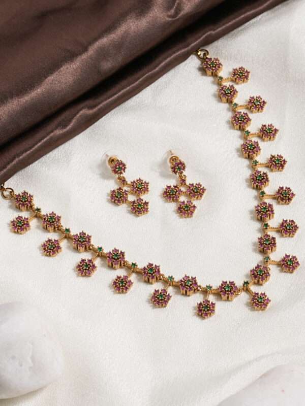 Graceful and richly detailed, this Vosgi floral drop necklace set blends traditional artistry with vibrant colour accents. The design features a structured gold-tone chain adorned with petite flower clusters, each highlighted by deep pink stones encircling a bright green center. Delicate dangling floral charms add movement and sparkle, creating a rhythmic, festive look across the neckline.
