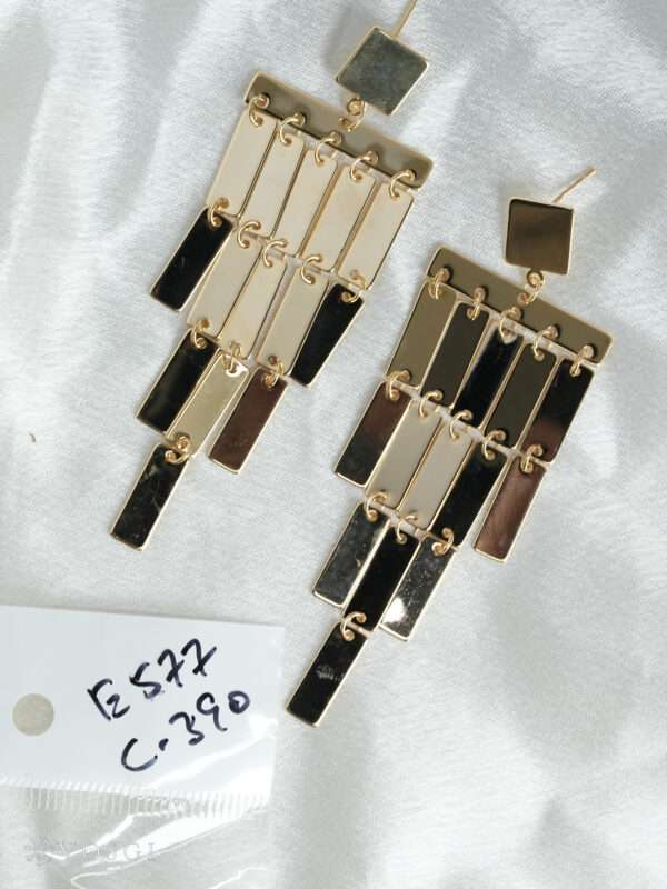 Elevate modern styling with these Vosgi gold geometric bar cascade earrings, designed for bold, architectural appeal. Featuring a square stud top leading into layered rows of polished rectangular bars, the earrings create a striking chandelier effect with fluid movement and high-impact shine.