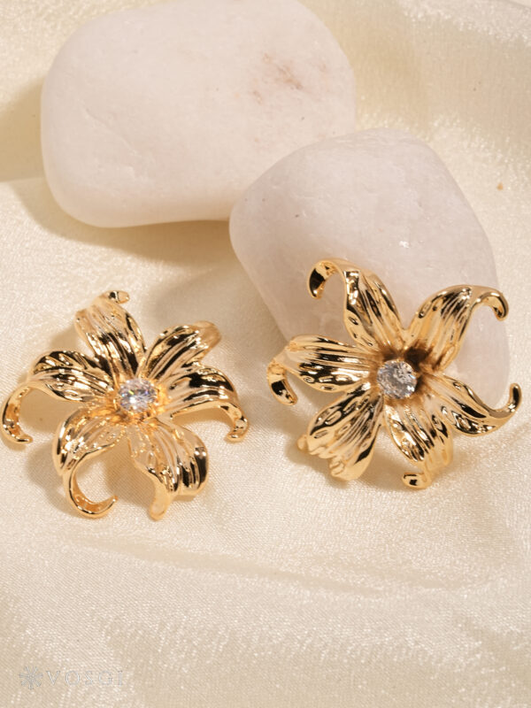 Illuminate your look with these Vosgi gold-tone curved petal crystal floral stud earrings, crafted to deliver bold elegance in a compact silhouette. Designed with six sculpted, high-shine petals that curl outward in fluid motion, each earring forms a striking flower shape that reflects light beautifully. At the center, a brilliant clear crystal adds a refined sparkle, creating a radiant focal point against the polished metallic finish.
