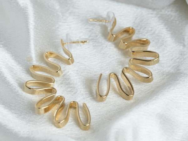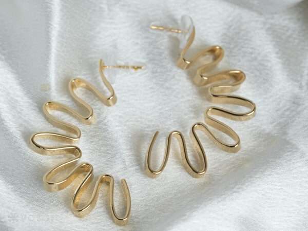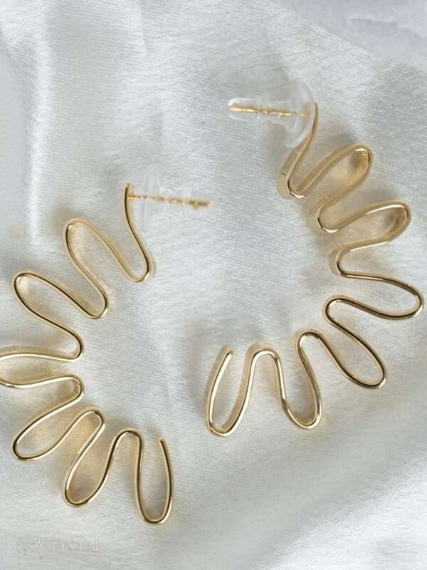 Elevate your everyday and occasion looks with these chic Vosgi minimal wave hoop earrings, designed for women who love contemporary elegance with a sculptural edge. Crafted in a fluid, open-loop silhouette, each earring features smooth gold-tone curves that create a rhythmic wave pattern around the ear. The high-polish finish reflects light beautifully, delivering a refined glow without overpowering your outfit.