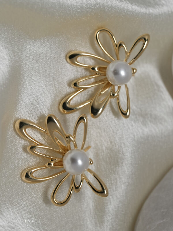 Bring sculptural elegance to your jewelry collection with these Vosgi pearl bloom wire petal statement studs. Crafted in a radiant gold-tone finish, each earring features flowing, looped metal petals arranged in a delicate floral silhouette, crowned at the center with a luminous pearl-like bead.