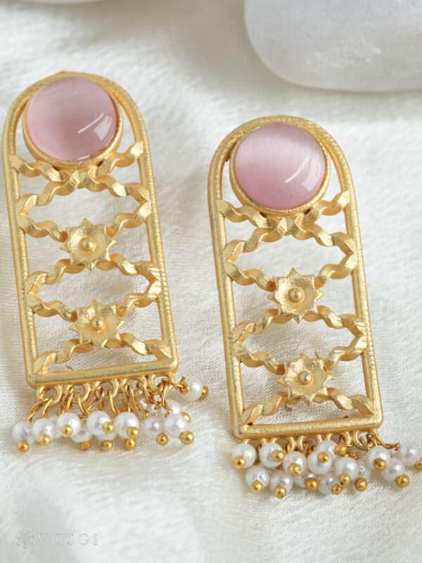Add soft colour and heritage charm to your festive wardrobe with these Vosgi pink stone pearl fringe gold drop earrings. Featuring a glossy blush-pink cabochon stone at the top, the design brings gentle elegance while standing out beautifully against the textured matte-gold frame.