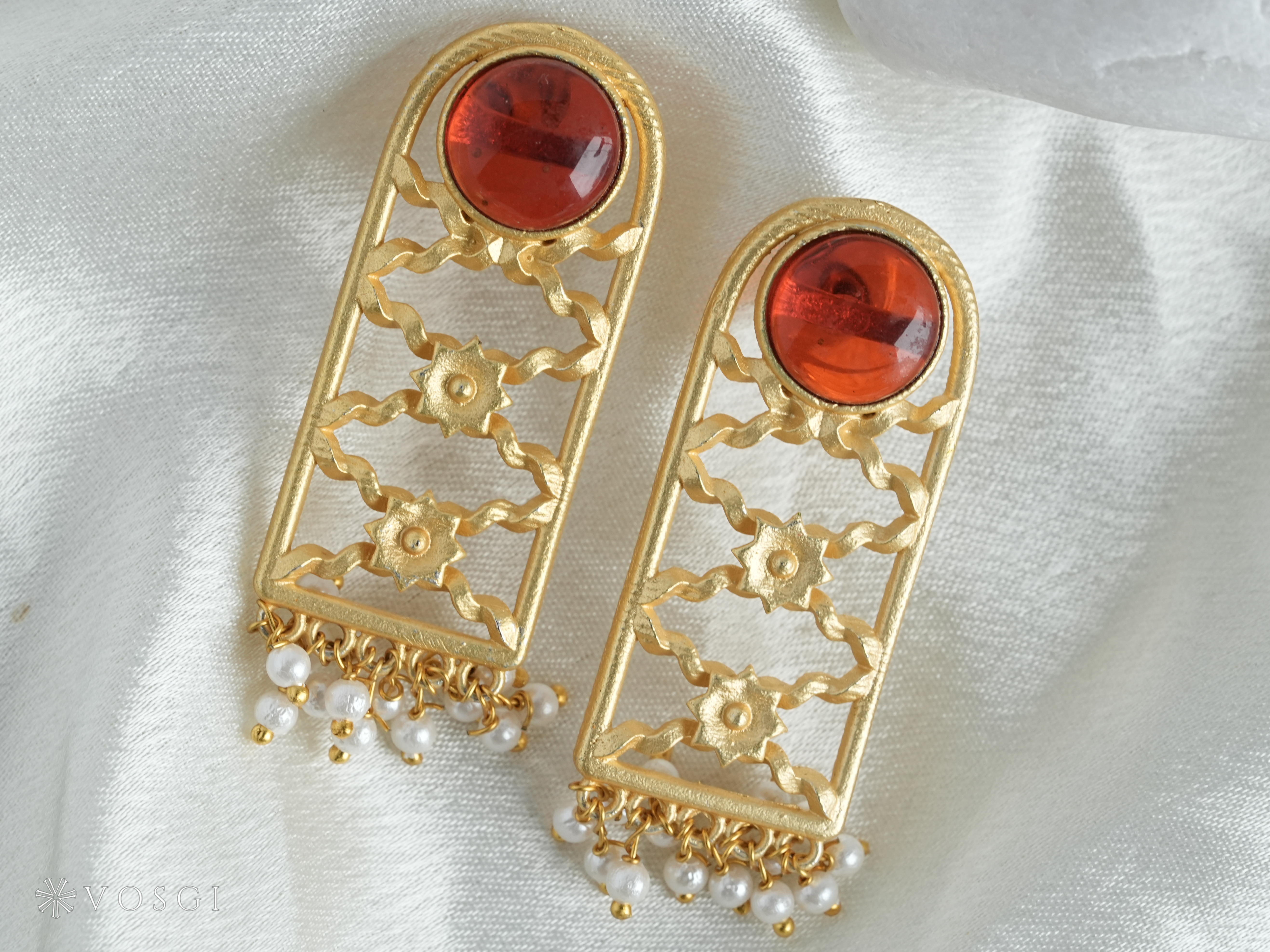 Add soft colour and heritage charm to your festive wardrobe with these Vosgi pink stone pearl fringe gold drop earrings. Featuring a glossy blush-pink cabochon stone at the top, the design brings gentle elegance while standing out beautifully against the textured matte-gold frame.