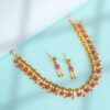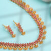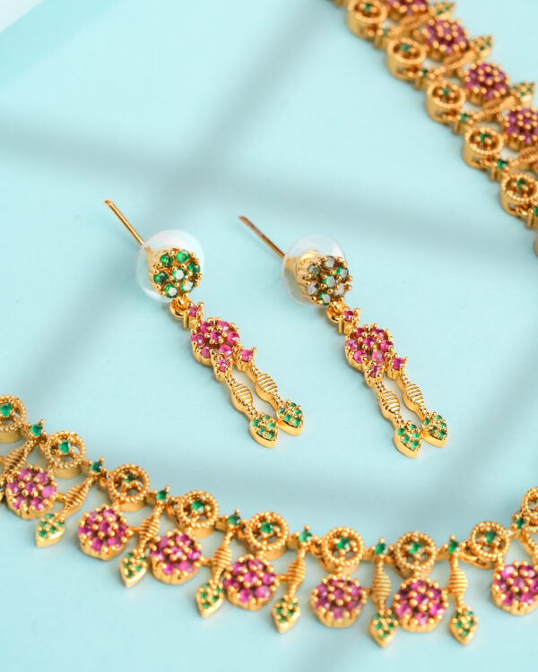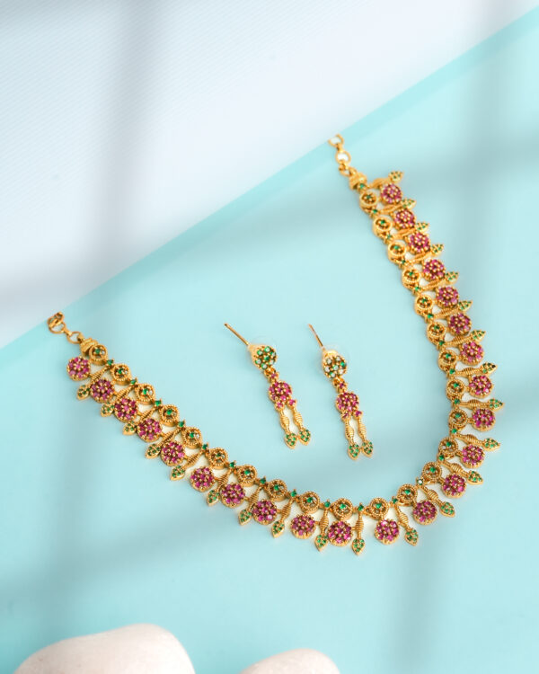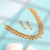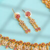 The matching drop earrings echo the floral theme with layered clusters and elongated gold-tone elements, creating a perfectly balanced ensemble for weddings, festive celebrations, and ceremonial occasions. The necklace includes an adjustable clasp for a tailored fit, while the earrings remain lightweight for comfortable extended wear.