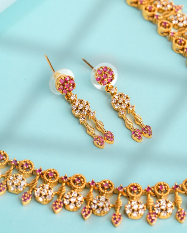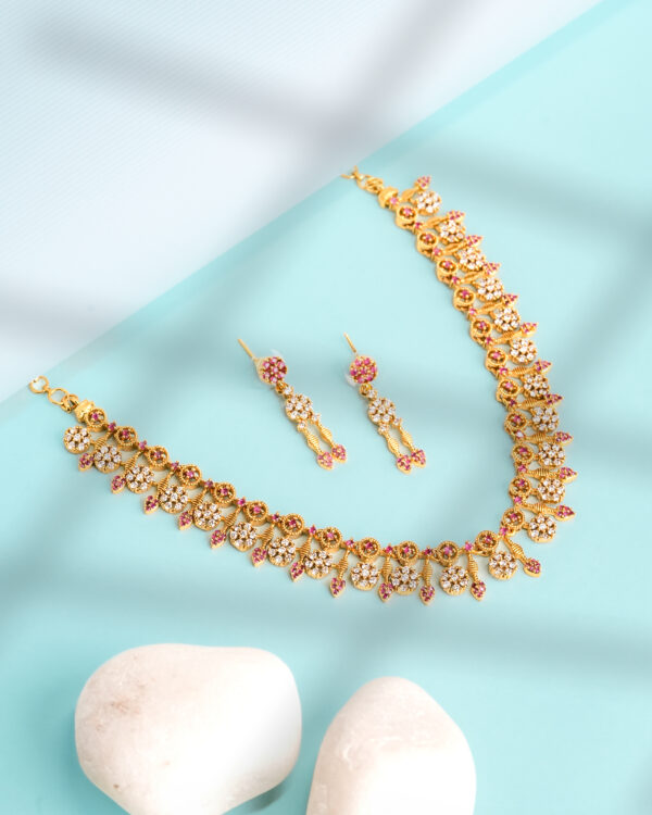 This luminous Vosgi necklace and earring set captures refined grandeur through a procession of floral clusters rendered in brilliant crystal-white stones and accented with ruby-pink highlights. The necklace features repeating blossom motifs, each framed in warm gold-tone metal and finished with delicate dangling elements that create graceful movement and light-catching sparkle along the neckline.