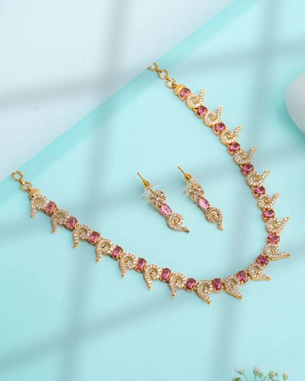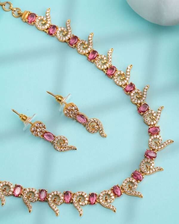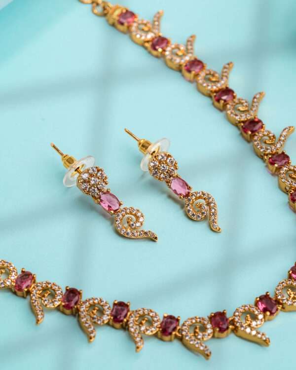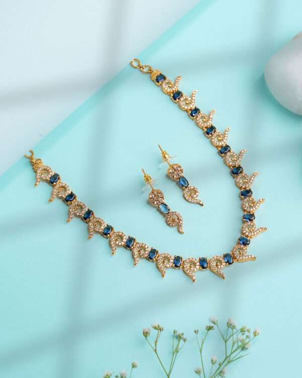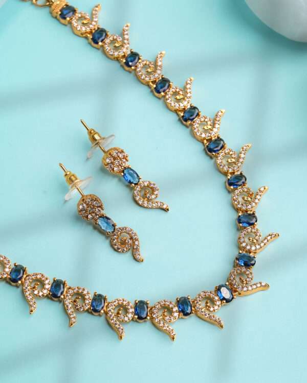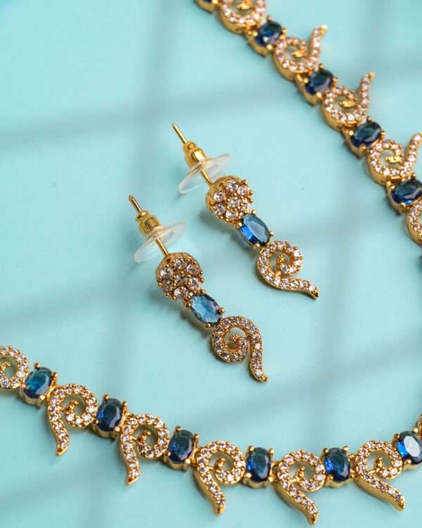 The coordinated drop earrings mirror the swirling silhouette with crystal clusters and oval blue stones, offering a perfectly balanced complement to the necklace’s ornate profile. The necklace includes an adjustable clasp for a tailored fit, while the earrings remain lightweight and comfortable for extended wear.