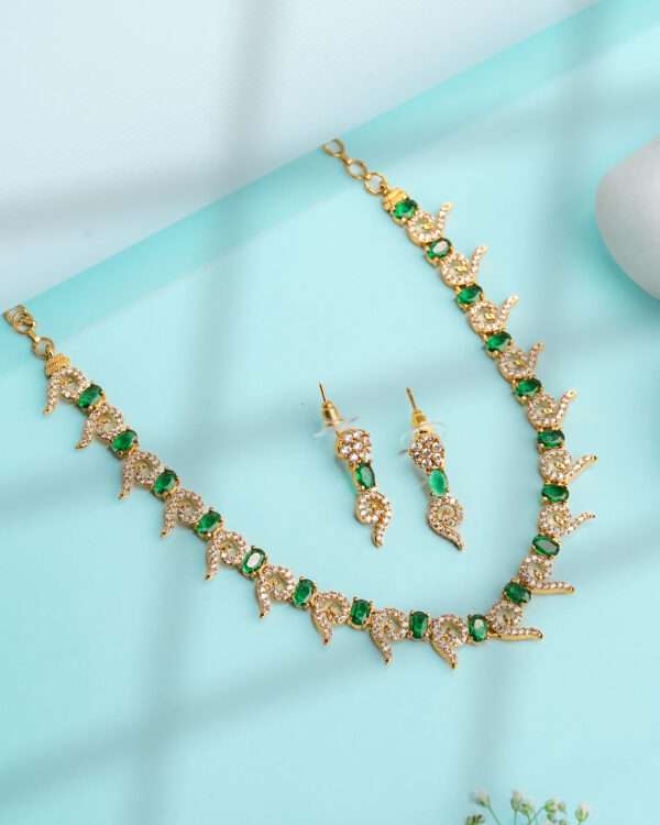 Crafted in a premium gold-tone alloy, the set features fine milgrain detailing and hand-finished textures that echo classical jewelry craftsmanship. Each stone is secured in micro-prong settings for durability and exceptional sparkle, reflecting Vosgi’s commitment to refined artistry. The stones appear to be premium-grade cubic zirconia, chosen for their diamond-like clarity and radiant fire, paired with richly saturated sapphire-toned accents for dramatic contrast.