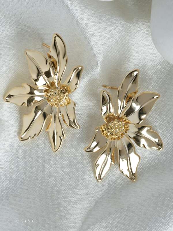 Bring radiant elegance to your look with these Vosgi sculpted gold floral stud earrings, designed to capture light and attention from every angle. Featuring organically shaped petals in a high-polish gold-tone finish, the flower silhouette feels fluid, artistic, and luxuriously modern.