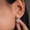 These luminous Vosgi earrings feature a dual starburst silhouette that blends celestial charm with refined sparkle. The upper stud forms a petite crystal star, while a delicately suspended floral burst below is crafted with marquise-cut stones arranged in radiant symmetry, creating graceful movement and high-impact brilliance with every turn.