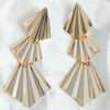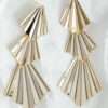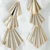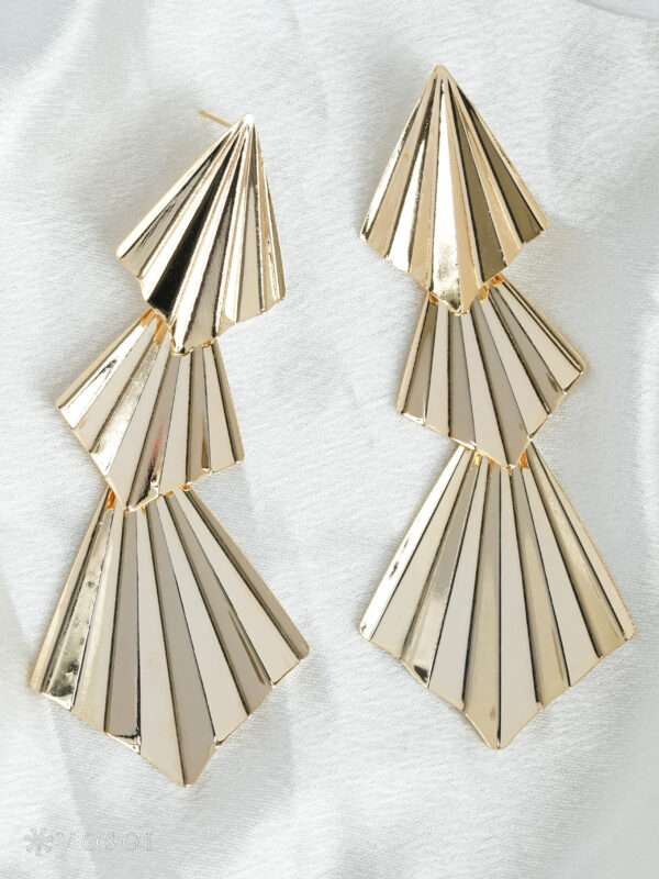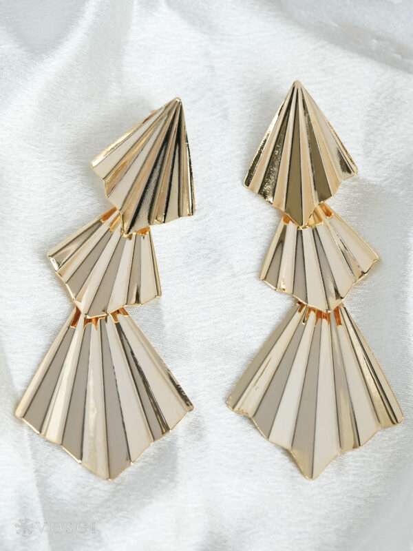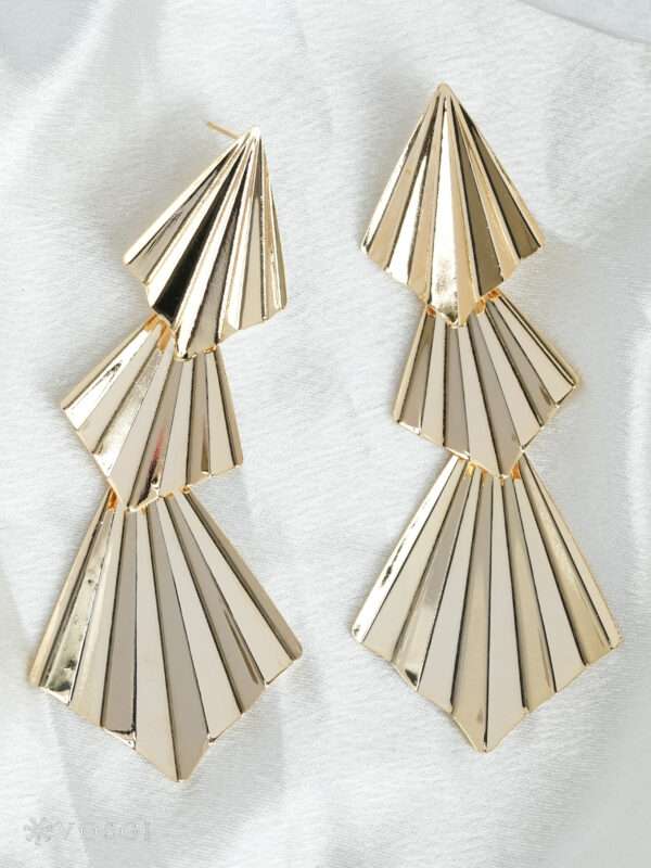 Make a bold style statement with these striking Vosgi triple-fan drop earrings, designed for women who love modern silhouettes with a touch of glamour. Crafted in a radiant gold-tone finish, the layered geometric panels form a cascading fan pattern that catches the light beautifully with every movement. The sleek, polished surface adds a high-fashion edge, making these earrings perfect for both festive occasions and contemporary evening looks.